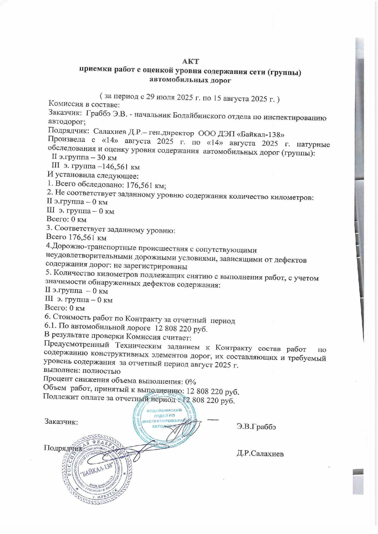 При этом официальная документация констатирует выполнение условий отыгранных госконтрактов. Согласно акту приемки работ за период с 29 июля по 15 августа 2025 года, подрядчик – ООО ДЭП «Байкал-138» – выполнил работы на 176,5 километра трассы, которые полностью соответствуют требуемому уровню содержания.