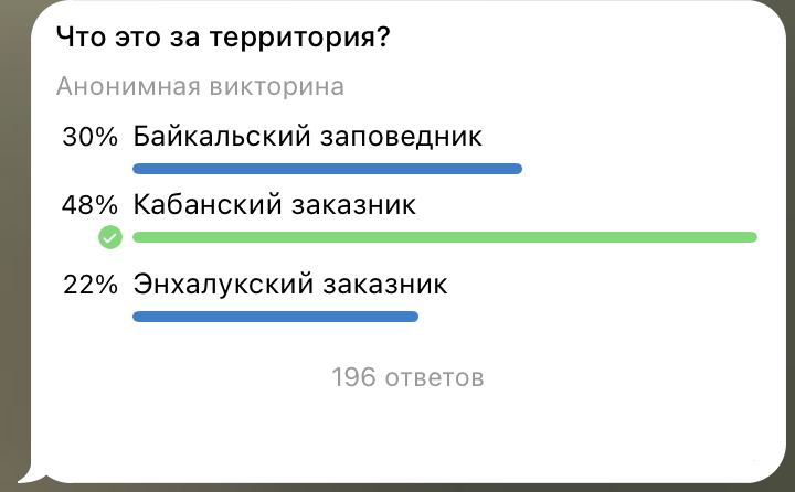 Телеграм-канал «Бурятия. Бабр. Дальше некуда» предложил читателям угадать, о какой природной территории идёт речь. Большая часть опрошенных (48 %) угадала, что это Кабанский заказник.