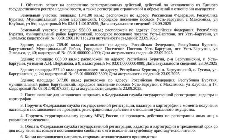 «Постановление о наложении ареста на имущество в администрацию не поступало», — сообщает глава Баргузинского района. Однако согласно закону «Об исполнительном производстве», постановление о запрете регистрационных действий направляют именно должнику (то есть МБУ «Культурно-информационный центр») и в Росреестр. Администрации района и поселения не входят в число обязательных адресатов.