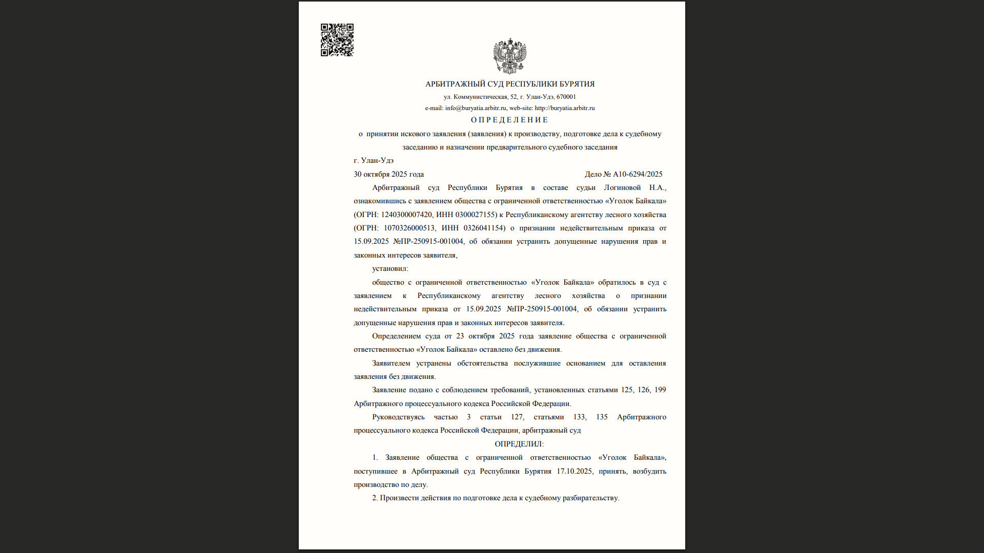 Компания ООО «Уголок Байкала» 22 октября подала иск в Арбитражный суд Бурятии к Республиканскому агентству лесного хозяйства (РАЛХ). Предприниматели требуют признать незаконным приказ ведомства, который заблокировал их проект по созданию рекреационной зоны в Прибайкальском районе. Заседание пройдёт 24 ноября.