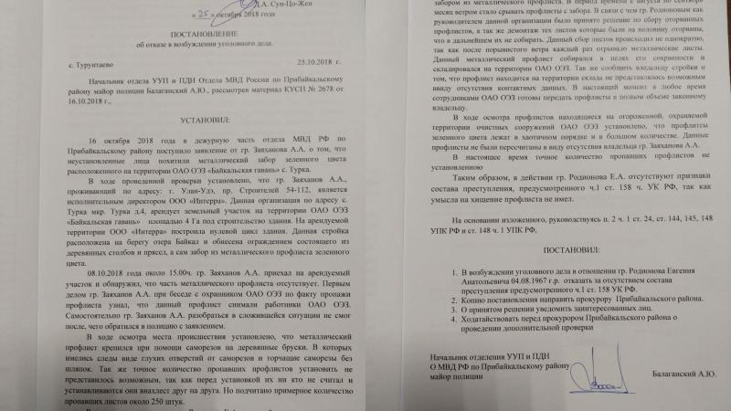 История, изложенная в постановлении, достойна отдельного рассказа. 16 октября 2018 года в полицию поступило заявление от исполнительного директора ООО «Интерра» Зарханова. Компания арендовала земельный участок на территории особой экономической зоны (ОЭЗ) «Байкальская гавань» и строила там некое здание. Стройка была обнесена забором из металлического профлиста зелёного цвета. 8 октября Зарханов обнаружил, что часть забора исчезла. В ходе беседы с охранником он выяснил, что профлист снимали работники ОАО «Байкальская гавань», управляющей компании всей зоны.
