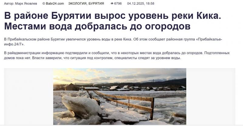 Самым ужасным инцидентом за декабрь в Прибайкалье стал потоп в селе Кика. 8 декабря глава лично приехал на берег реки, сделал фото и написал: «Ситуация контролируемая». А в ночь с 12 на 13 декабря (аккурат после юбилейных банкетов), река вышла из берегов. Ледяная каша (шуга) забила русло. Вода, не найдя выхода, хлынула в посёлок. Затопило дворы, подвалы и стайки. Люди в панике спасали имущество, но скот погиб, свиньи вмёрзли в лёд прямо в сараях.