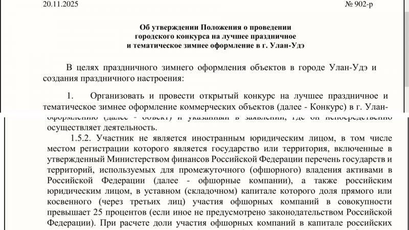 Самый вопиющий документ расследования Бабра скрывался в пакете конкурсной документации на «Лучшее новогоднее оформление», который опубликован на сайте мэрии. Шутенков выделил один миллион рублей на призы для предпринимателей. Идея выглядит здраво, бизнес тратит свои кровные на украшение города, а власть компенсирует часть затрат победителям. Однако юристы городской администрации превратили требования к простому конкурсу фотографий витрин в бюрократический бред. Возможно, они использовали нейросети для составления документов, потому что реальный человек так «галлюцинировать» не может.