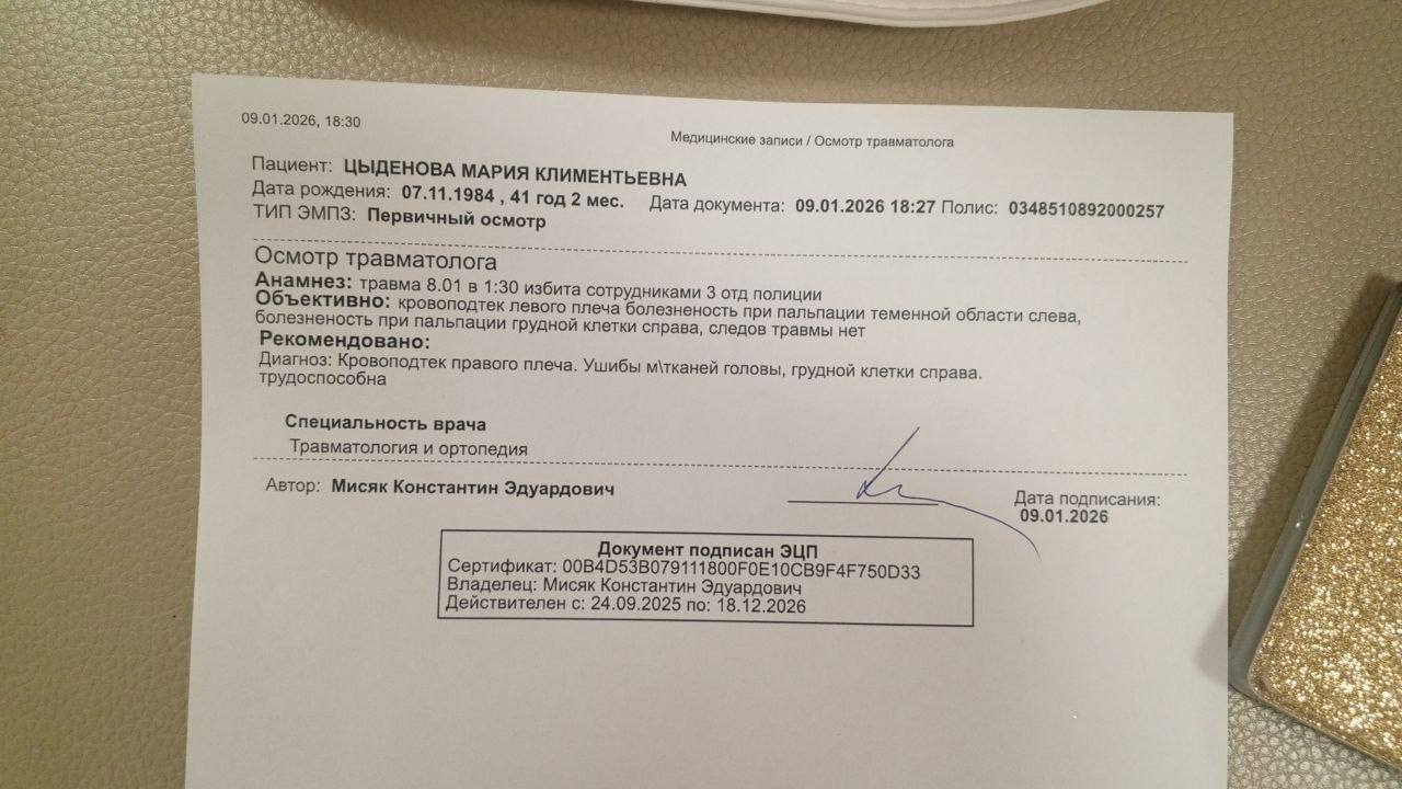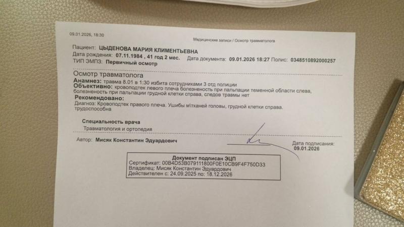 Официальный комментарий полиции гласит, что физическая сила и спецсредства не применялись при задержании. Но это утверждение опровергает документ из травмпункта. Мария заявила адвокату, что в отделе ей заломили руки, нанесли удары по спине и голове. 9 января врачи осмотрели пострадавшую и отметили кровоподтёк правого плеча, ушибы мягких тканей головы и грудной клетки справа.