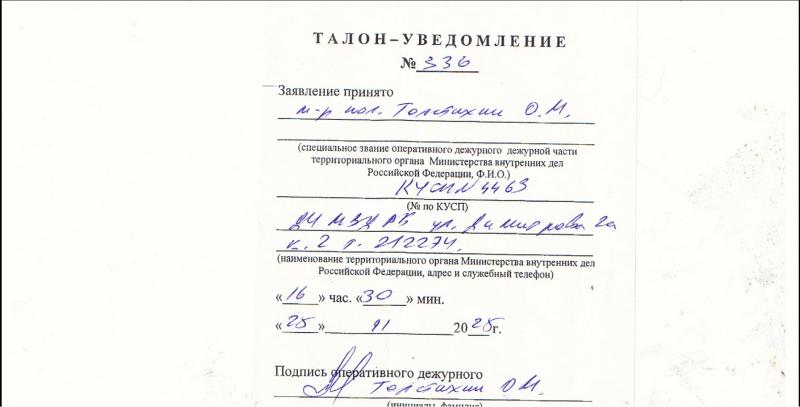 Талон-уведомление № 336 от 25 ноября 2025 года о принятии заявления в МВД РБ