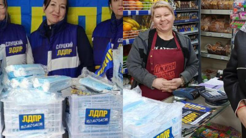 Активисты ЛДПР торжественно вручают жителям пачки медицинских масок