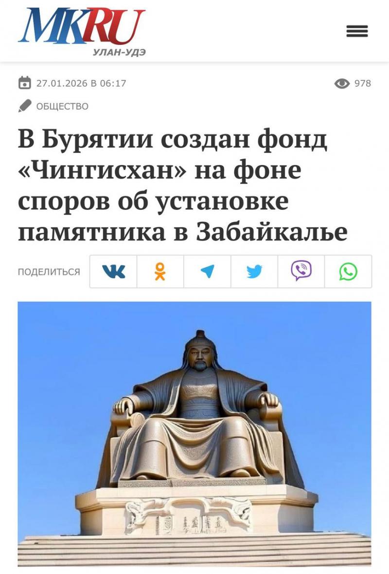 Недавно пролетела новость, что в Бурятии создан фонд «Чингисхан». В 2025 году власти Забайкальского края объявили о планах сделать Чингисхана туристическим брендом региона, разработать маршрут «По следам великого Чингисхана» и установить скульптуру молодого полководца высотой 5 метров рядом с посёлком Агинское.