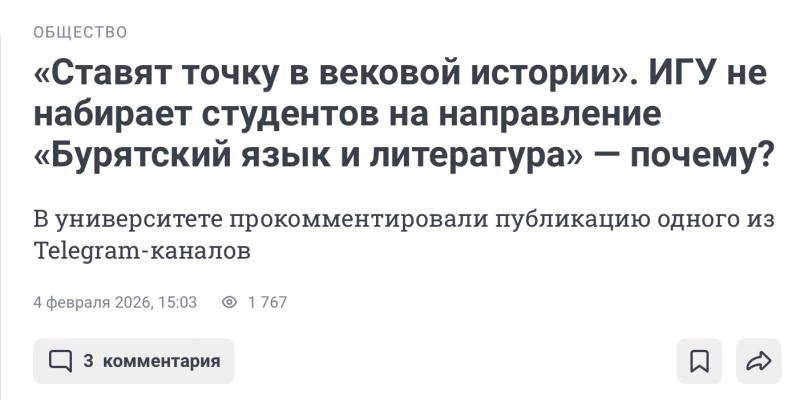 #Нампишут: Только абсолютно равнодушные к сохранению бурятского языка, к ситуации с ним в Иркутской области и Усть-Ордынском округе, могут не знать реального положения дел. Начиная с 90-х годов набор на эту специальность падает, число бюджетных мест, соответственно, снижается.