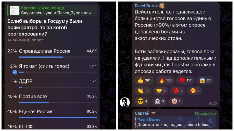 Местные партийные отделения по всей стране попали под раздачу. И без того тяжёлую электоральную ситуацию добил основатель Telegram Павел Дуров, который в апреле публично уличил политтехнологов партии в накрутке. По его статистике, более 90% голосов за партию в опросе популярного политического блогера Александра Картавых сгенерировали боты из «экзотических стран». Вместе с этим провалилась попытка загнать лояльный электорат на электронные праймериз из-за того, что сайты партии до сих пор недоступны во многих регионах вследствие проблем с формированием «белых списков» Минцифры РФ.