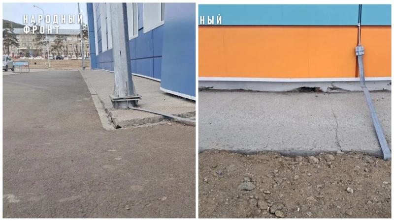 Может, Бадарханов поддался соблазну лёгкого заработка, но в целом с задачей справился? Мэрия сдала готовый объект в эксплуатацию в апреле 2025 года. Спустя год асфальт покрылся трещинами, а фасадная краска отслоилась. Бетонная отмостка просела ниже уровня фундамента, утянув за собой фонарные столбы.