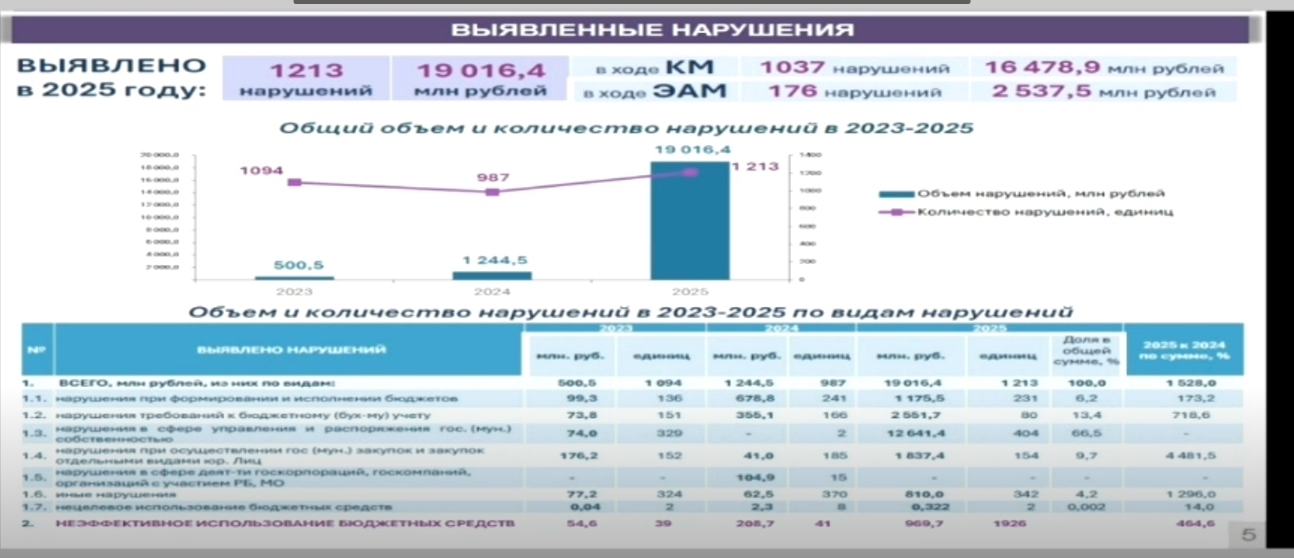 Также подрядчики не выплатили 425 миллионов рублей неустоек за срыв контрактов. В итоге нарушители по протоколам аудиторов получили наказания в виде штрафов на общую сумму 102 тысячи рублей. Кроме того, местная номенклатура увеличила количество случаев неэффективной траты бюджетных денег в 47 раз. Аудиторы насчитали 1926 эпизодов разбазаривания средств. Силовики по этим данным возбудили всего три уголовных дела.