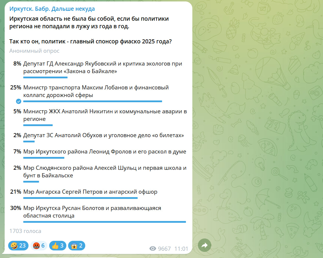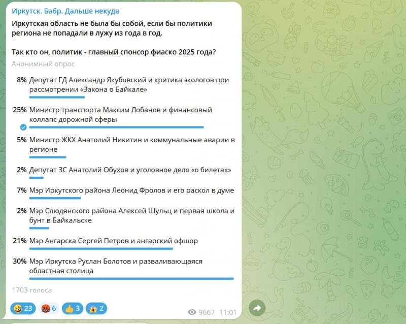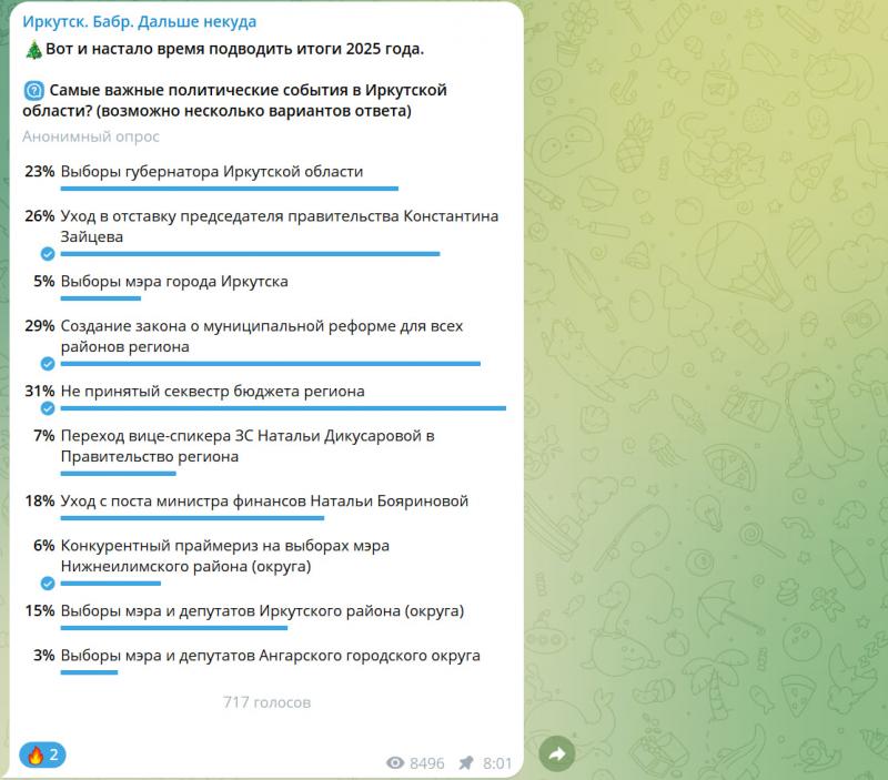 Подходит к концу 2025 год, ставший для Иркутской области временем напряженных политических процессов и значимых кадровых изменений в стенах Серого дома. Результаты серии анонимных опросов в телеграм-канале «Иркутск. Дальше некуда» позволяют оценить, какие события и персоны региональной политики оставили наиболее яркий след в умах жителей.