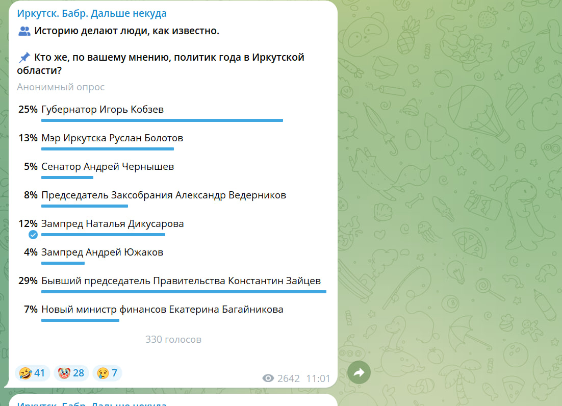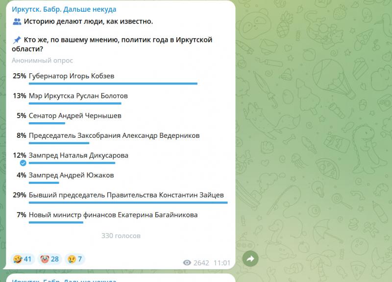 Бабр представляет еженедельную подборку главных событий Иркутской области по версии телеграм-каналов с 8 по 14 декабря включительно. Устав не принят Все более плачевно выглядит позиция новоизбранного мэра Иркутского округа Леонида Фролова.