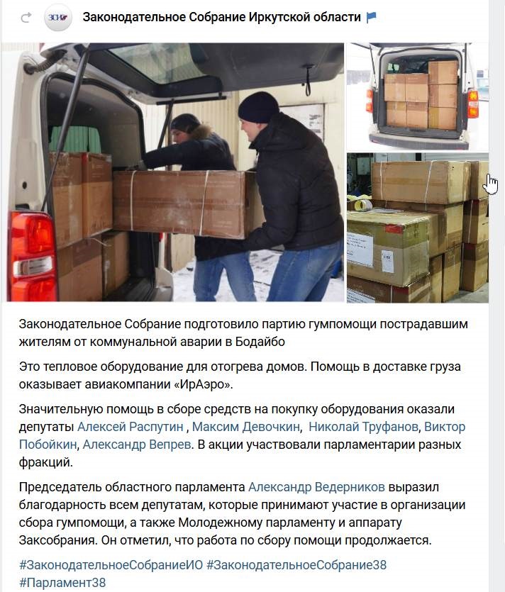 Тем временем Заксобрание перечислило имена тех депутатов, которые участвовали в сборе средств для отогрева (уже в прямом смысле) Бодайбо, где вышли из строя четыре котельные. И вот в связи с этим вопрос: а что же остальные? Ну вот хотя бы носитель типичной северной фамилии, строительный магнат Алексей Красноштанов? И почему Заксобрание (которое вроде как партийной принадлежности не имеет) прилежно перечисляет депутатов-единороссов, а представителей других фракций определяет просто толпой?