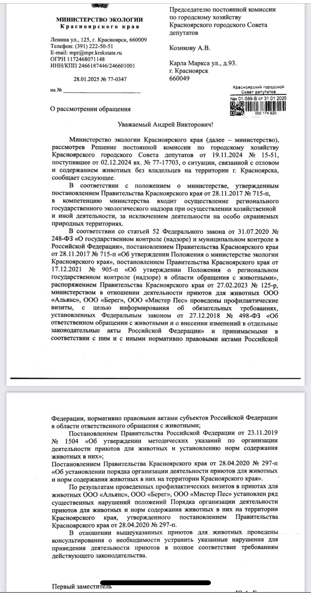 «И вот контролирующий, согласно закону, орган – Минэкологии КК – провел РАБОТУ!!! Вздрючил частные приюты, занимающиеся отловом и содержанием безнадзорных животных в Красноярске…Мужественно УКАЗАЛ на их несоответствие!!!