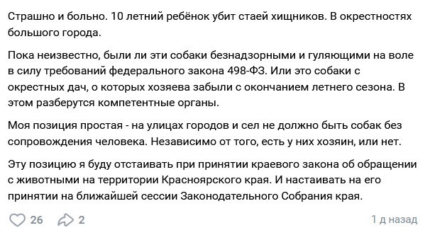 Только что Дроздов, как ни в чём не бывало, написал VK: «Моя позиция простая – на улицах городов и сел не должно быть собак без сопровождения человека. Независимо от того, есть у них хозяин, или нет. Эту позицию я буду отстаивать при принятии краевого закона об обращении с животными на территории Красноярского края. И настаивать на его принятии на ближайшей сессии Законодательного Собрания края». А это ваша «до одури» простая позиция – не слишком ли проста??? И не слишком ли поздно вы очнулись???