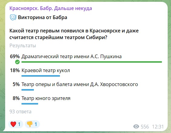 Настало время подвести итоги опроса и викторины, которые касались театральной тематики. Бабр решил поинтересоваться у подписчиков, какие театры они предпочитают посещать, и какой театр первым появился в Красноярске и считается старейшим в Сибири? Удивительным образом правильный ответ викторины совпал с выбором театра нашими подписчиками.