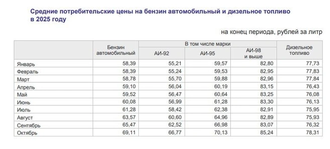 Цена на АИ-92 в октябре 2025 года оказалась на 23% выше, чем в октябре 2024 года. Если сравнить с концом прошлого года, рост составил 21%. В январе литр стоил 55,2 рубля, а к октябрю цена поднялась до 66,7 рубля.