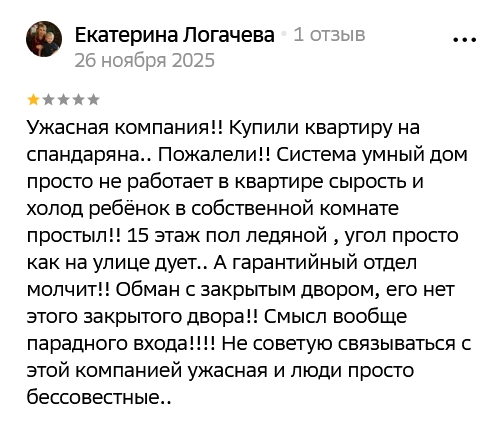 Отзывы свежие. Вот, например, 4 декабря 2025 год, жительница Наталья пишет о том, что компания ужасная, новая квартира в Академгородке холодная, никто с этой проблемой помочь не может.