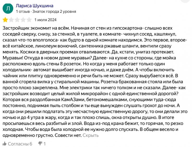 Также люди пишут, что квартиры дорогущие, а их качество оставляет желать лучшего. На примере того же Академгородка: парковок нет совсем, только подземные, а значит – платные. Застройщик экономит на всём, начиная от стен из гипсокартона. Линолеум вонючий, сантехника ржавая, вентили нужно менять сразу. Косяки в дверных проёмах отваливаются. Унитаз протекает. Есть даже незваные гости в виде муравьёв.