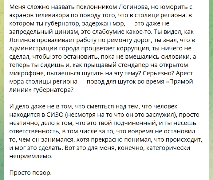 «От руководителя региона ждёшь чего-то большего. Считаю, что это одна из самых провальных прямых линий губернатора за всю его работу на посту. Не хватает открытости, искренности, смелости… Смелости хотя бы принимать звонки от людей, как это недавно делал глава Хакасии Коновалов».