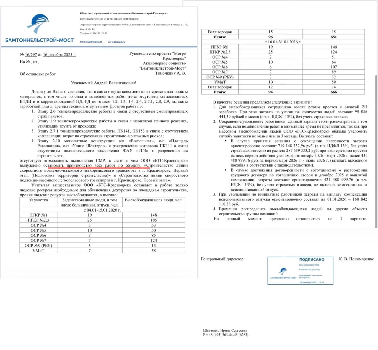 Из письма следует, что ситуация вынуждает руководство массово отстранять людей от работы. С 16 января 2026 года на строительных площадках останутся всего 94 сотрудника для охраны и дежурства, тогда как 666 человек будут «высвобождены». Генеральный директор предлагает ввести режим простоя с выплатой 2/3 от зарплаты. Только на эти минимальные выплаты компании потребуется более 95 миллионов рублей в месяц.