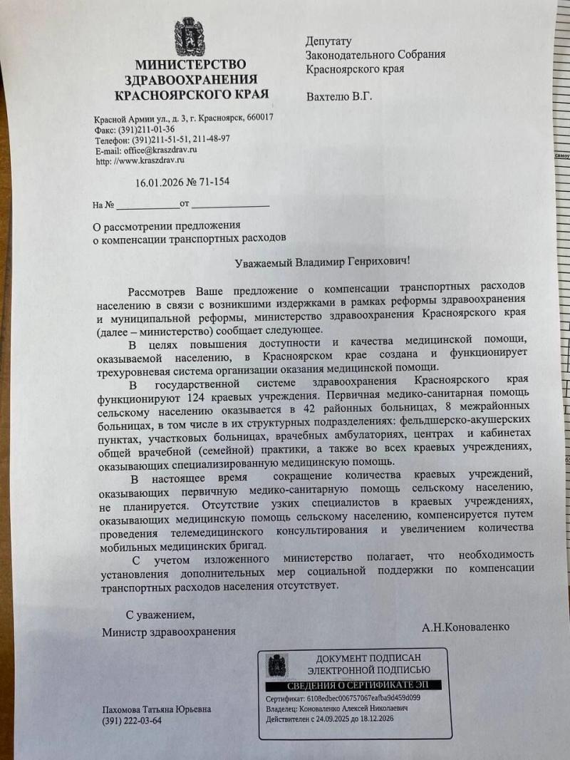 Такую позицию ведомство озвучило в ответе на запрос депутата Заксобрания Владимира Вахтеля. Парламентарий опубликовал документ в своем телеграм-канале. На сессии в декабре 2025 года,он предложил возмещать людям расходы на дорогу, которые резко выросли после реформы здравоохранения и муниципальной реформы.