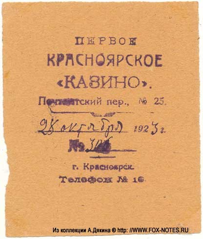 Итак, первое и единственное официальное советское казино появилось в Красноярске осенью 1924 года. Оно располагалось в деревянном доме, ныне это улица Вейнбаума, 25. В основном в казино играли в лото и карточные игры (преферанс, винт, шестьдесят шесть). Игорное заведение просуществовало до 1928 года. Все доходы от казино шли на создание ночлежек для беспризорных детей. Пойти на этот шаг депутатов «вынуждала беспросветная нужда»*.