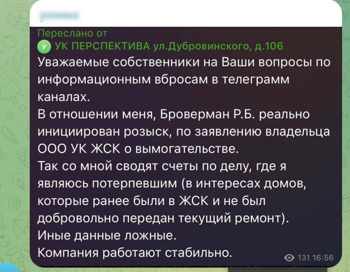 Продолжение про розыск Бровермана. Его УК «Перспектива» рассылает по чатам жильцов сообщения, что он действительно в розыске, но ни в чём не виноват. Также Броверман пишет в местные СМИ, что он никуда не сбегал и не прятался, а уехал на лечение. И во время его отъезда на него возбудили дело.