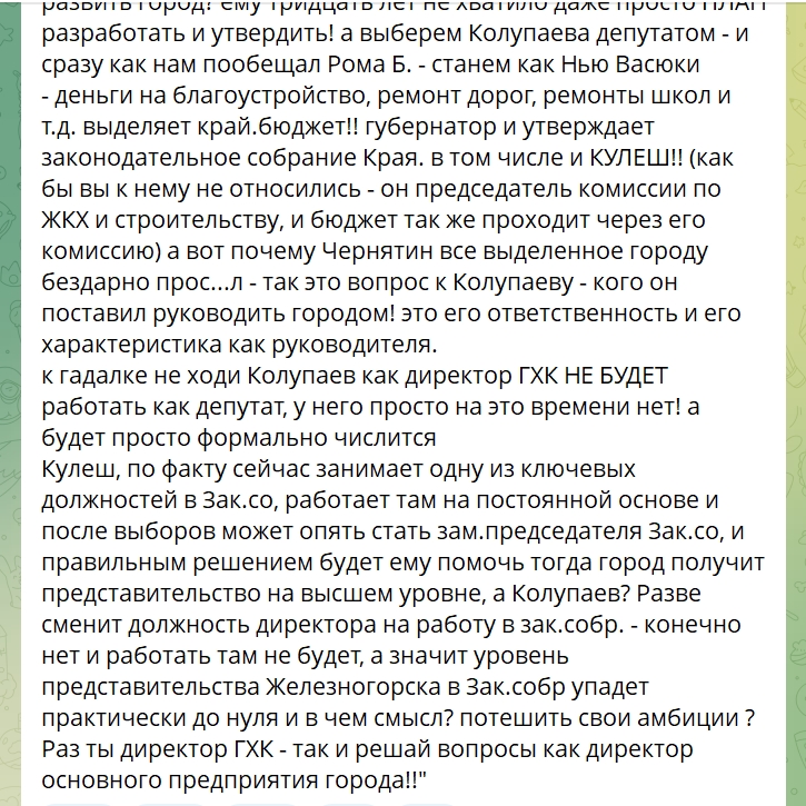 По всей видимости, в ответ на такой пассаж Алексей Кулеш достал из рукава джокер и опубликовал в своём телеграм-канале комментарий размером с простыню. По словам Кулеша, этот комментарий он нашёл под публикацией канала, который администрирует предвыборный штаб «Росатома». Сейчас этого комментария уже нет – его удалили.