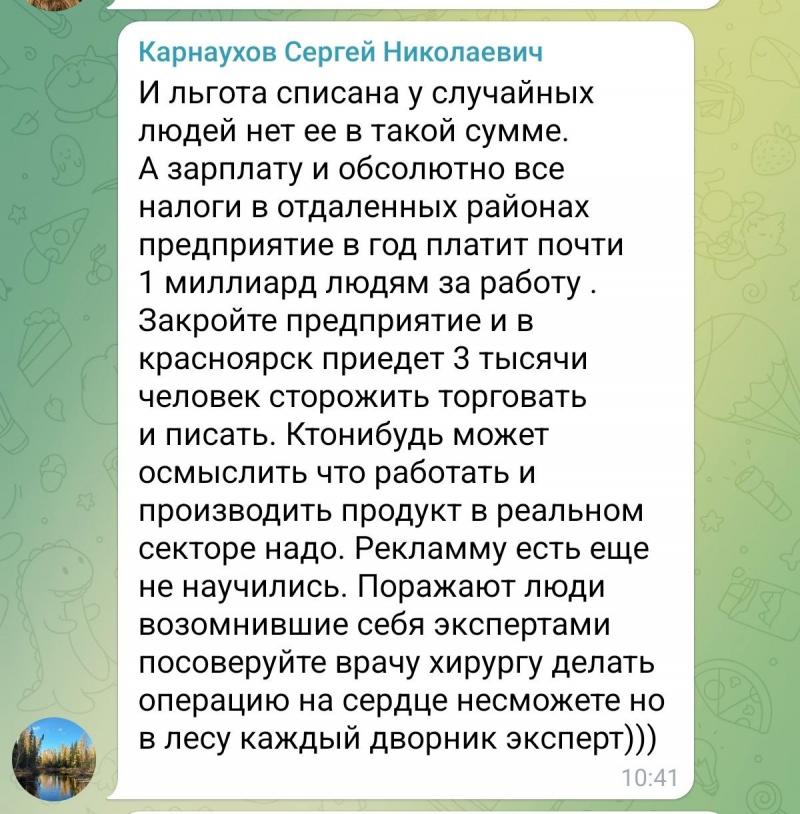 – Коллеги, на три вещи можно смотреть бесконечно. Две вы и так знаете, а еще на то, как бывший заместитель министра лесного хозяйства Красноярского края отважно приходит в комментарии к постам в интернетах, чтобы буквально собственной грудью защитить от нападок компанию «Краслесинвест». У которой, как мы тут знаем, появились довольно серьезные проблемы.