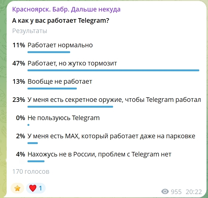 У 47% мессенджер работает, но жутко тормозит. Есть те, у кого Телеграм работает нормально, кто-то использует секретное оружие. Не обошлось и без тех, кто установил национальный мессенджер МАХ.