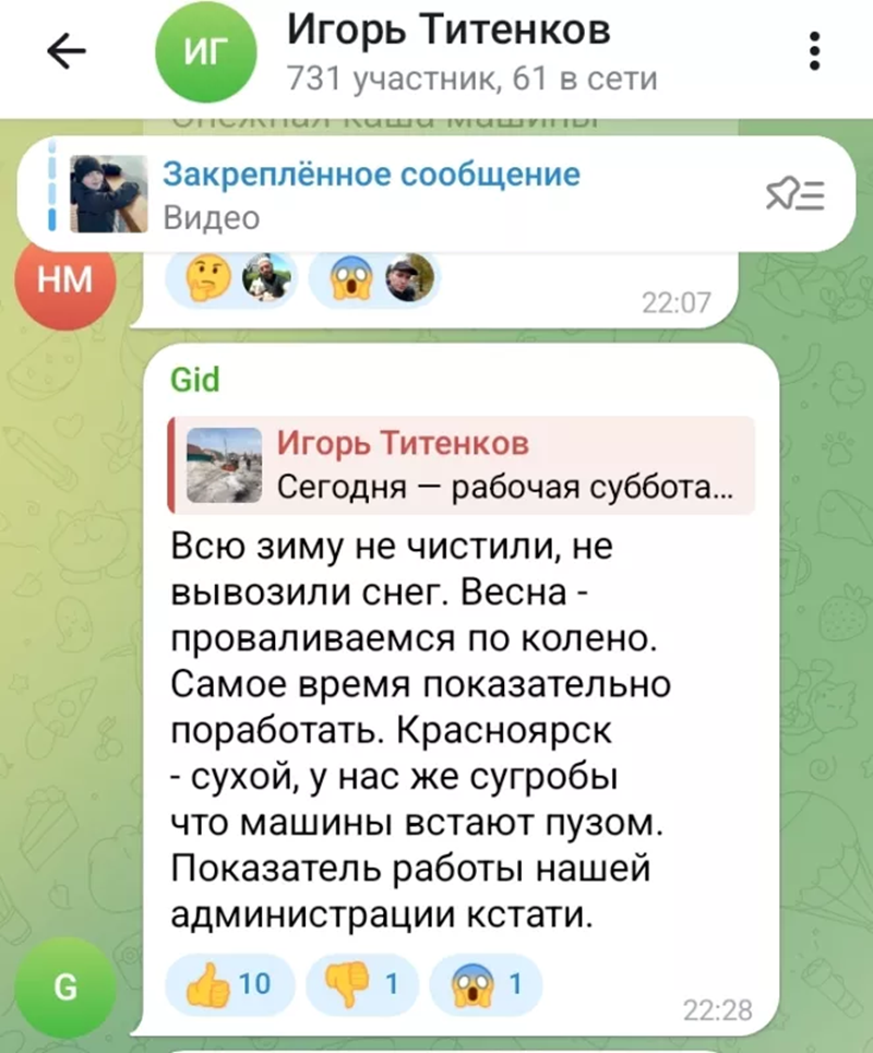Бабр представляет обзор ключевых событий и обсуждений в красноярском сегменте мессенджера Telegram за неделю с 16 по 22 марта включительно.