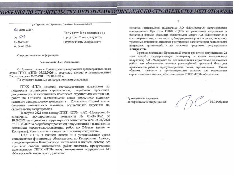 Красноярские власти не ответили, почему сорваны сроки строительства метро, и кто ответственен за это. Запрос делал депутат горсовета Иван Петров (ЛДПР), ему ответили из госучреждения «Центр транспортной логистики» (ЦТЛ), которое от имени краевого правительства выступает заказчиком.