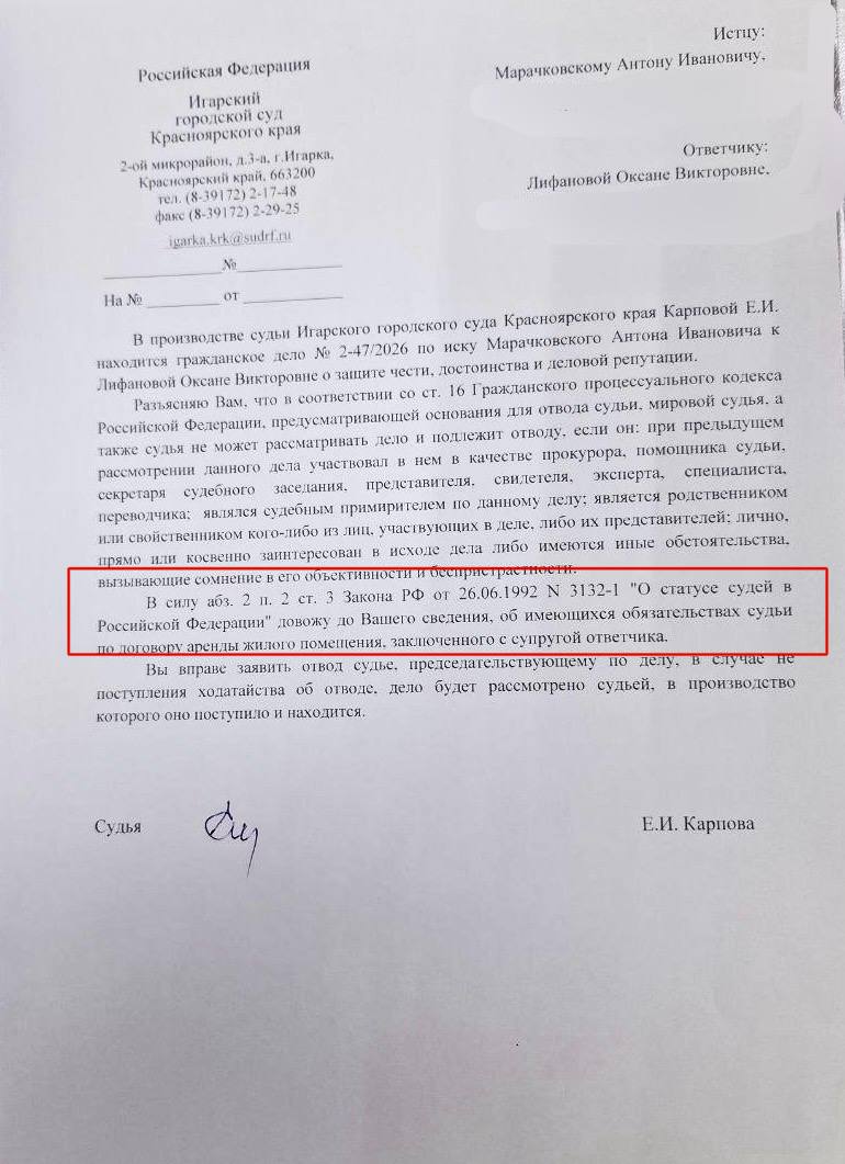 Судья Карпова предупредила ответчицу, что снимает квартиру «у супруги ответчика». Не очень понятно, что имела в виду судья, но так как у Оксаны Лифановой нет супруги, видимо речь идет о супруге истца, депутата Марачковского. Посмотрим, как будет идти процесс, – поделился подробностями политолог Алексей Аксютенко.