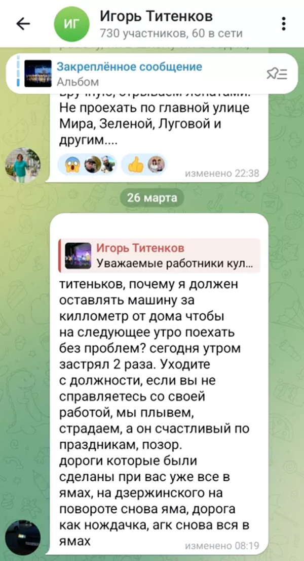 У людей стали возникать вопросы к местным властям, а конкретно к главе округа Игорю Титенкову. Общие настроения и волнения сформулировал один из подписчиков телеграм-канала Титенкова, предложивший главе уйти в отставку.