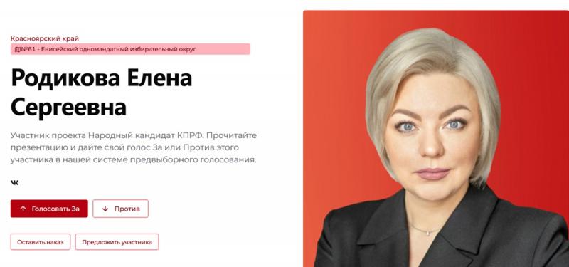 • Елена Родикова, недавно присоединившаяся к фракции КПРФ в региональном парламенте, уже штурмует федеральные высоты – она попробует свои силы в Енисейском округе №61.