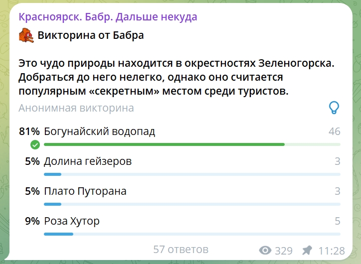 Красноярцы отлично знают туристические места, которые находятся в крае. По крайней мере, об этом можно судить по викторинам, которые Бабр регулярно проводит в своём телеграм-канале. На этот раз вопрос был с небольшим подвохом, однако это не застало наших подписчиков врасплох. Большинство из них знают, что в окрестностях Зеленогорска находится красивейший Богунайский водопад.