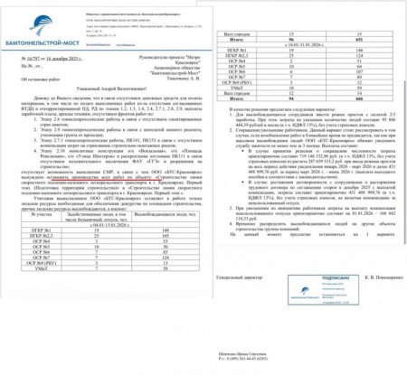 Подрядчик полностью остановил строительство линии скоростного подземно-наземного легкорельсового транспорта в Красноярске. Об этом сообщил политический консультант Алексей Аксютенко, ссылаясь на письмо гендиректора компании «Бамтоннельстрой-Красноярск» Константина Пономаренко.