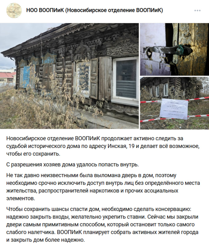 В данный момент мэрия Новосибирска судится с владельцами одной из двух квартир. Собственники не хотят переселяться в ту жилплощадь, которую им выделила администрация. Заметим, что в доме по Инской, 19 сейчас никто не живёт. 2 ноября 2025 года НОО ВООПИиК опубликовало следующую запись: