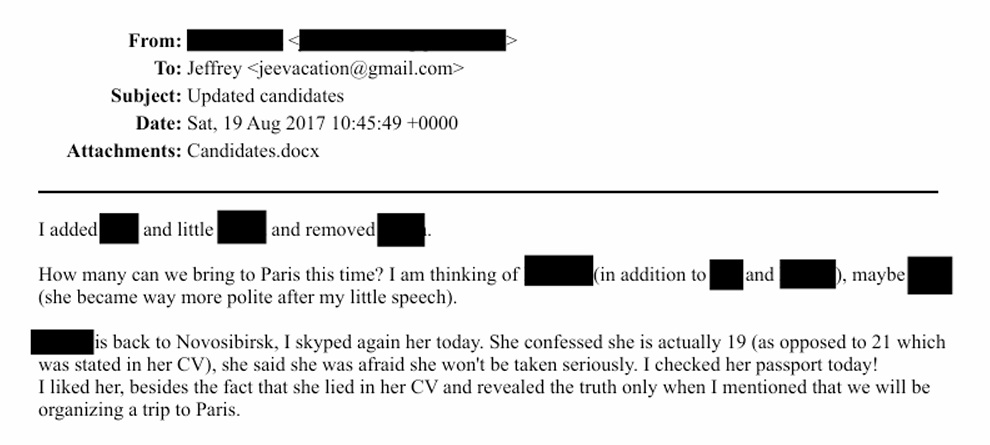 Базой для этой деятельности, по данным расследований, служил отель DoubleTree by Hilton в центре Новосибирска. Именно там Даша работала в период активной переписки с Эпштейном и именно там она, судя по всему, искала будущих жертв. В одном из писем от августа 2017 года неустановленный отправитель докладывал миллиардеру о новой кандидатке из Новосибирска: девушка в резюме указала возраст в 21 год, но после «серьёзного разговора» по Skype призналась, что ей всего 19. Джеффри Эпштейн лично просматривал сканы паспортов сибирячек, одобряя или бракуя их. Особое внимание уделялось их готовности лететь в Париж по первому зову, а Даша Б. выступала гарантом того, что «товар» будет доставлен в срок и в должном виде.