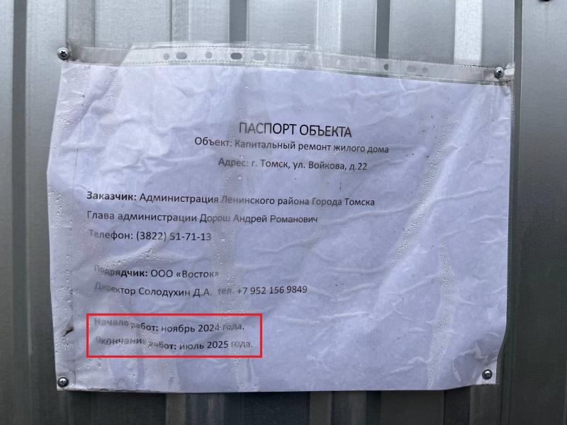 В конце августа 2024 года люди, прописанные на Войкова, 22, начали бить тревогу, ведь ремонт их дома никак не начинался. Выступили и мэр Томска, и подконтрольный ему теперь уже экс-глава администрации Ленинского района. Однако произошла неувязка. Дмитрий Махиня заявил, что восстановление жилого объекта скоро начнётся, тогда как Андрей Дорош сказал, что из-за «определённых сложностей» подрядчика придётся сменить.