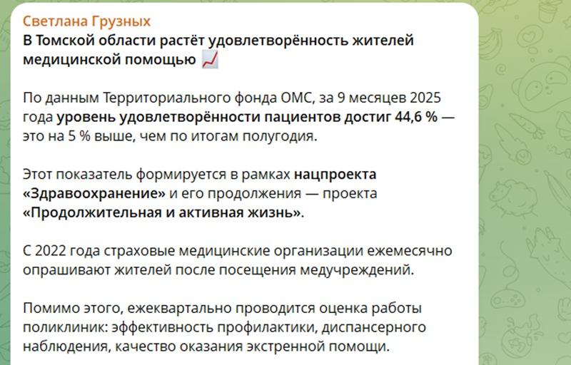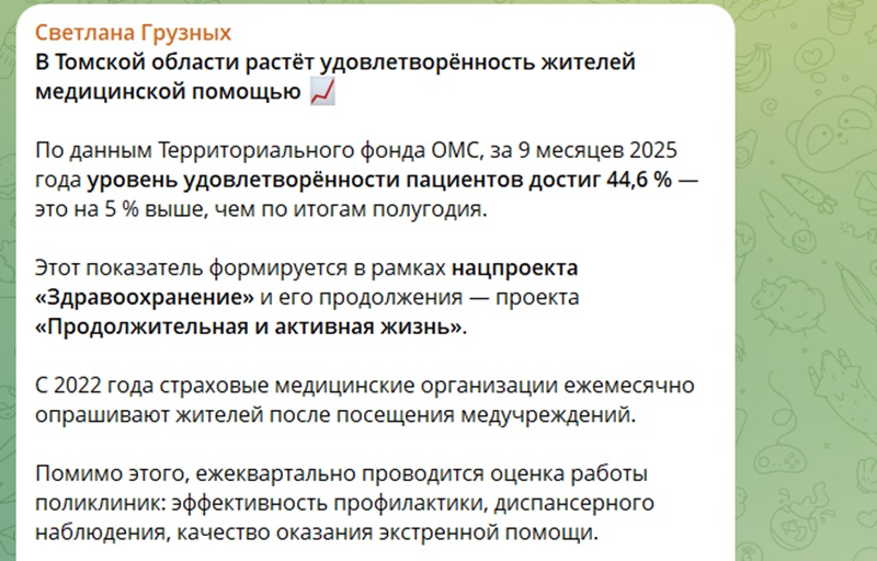 Этот провал стал логичным продолжением недавнего скандала с «самообманом» местной администрации. Напомним, заместитель губернатора по социальной политике Светлана Грузных в своём телеграм-канале убеждала, что всё улучшается. Она заявила, что по итогам девяти месяцев 2025 года уровень удовлетворённости пациентов якобы вырос до 44,6 % — на 5 % выше, чем было в начале года. Выходит странная картина: в отчётах Грузных показатели растут, а регион скатывается к нижним строчкам федеральных рейтингов. Видимо, чиновники и обычные томичи живут в разных реальностях.