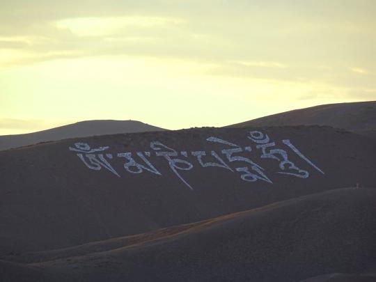 Склон высокого холма напротив Кызыла украшает гигантская тибетская мантра "Ом мани падме хум"