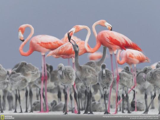 Второе место в той же категории занял Алехандро Прието. Фотография показывает, как взрослый фламинго кормит своего птенца.