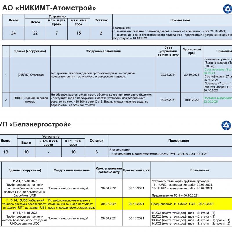В докладе самого «Росатома» от 30 сентября 2021 года говорится о «не герметичности строительных конструкций». Что это значит? Протекает крыша. Не завершены работы и по устройству полов. Не завершены пусконаладочные работы по инженерным системам зданий и сооружений первого пускового комплекса. То есть, работы которые должны были завершить до запуска станции в промышленную эксплуатацию, чтобы выявить возможные неполадки, до сих пор не завершили. Не будем голословно обвинять «Росатом» в халатности, а просто оставим скрин их же презентации ниже.