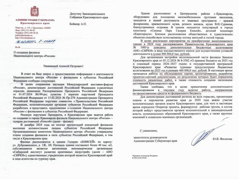 В конце января губернатор Красноярского края Михаил Котюков сообщил, что в Красноярске появится один из первых филиалов национального центра «Россия», которые должны создать в регионах по поручению президента. Филиал задуман как наследие масштабной выставки «Россия», которая в 2024 году прошла в Москве.