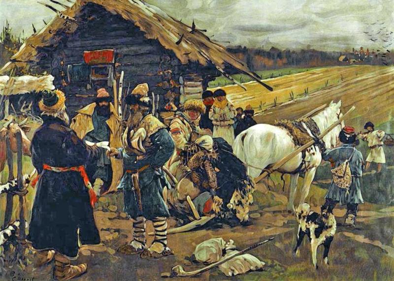 В преамбуле Уложения царя Василия Шуйского о крестьянах 1607 года было записано: «при царе Иоанне Васильевиче… крестьяне выход имели вольный, а царь Фёдор Иоаннович, по наговору Бориса Годунова, не слушая совета старейших бояр, выход крестьянам заказал и, у кого колико тогда крестьян было, книги учинил…». Документ этот не сохранился, но остался его пересказ в изложении российского историка В. Н. Татищева (XVIII в.).