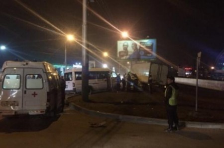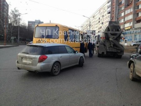 ДТП произошло около шести часов вечера 11 апреля на перекрестке улиц Гусарова и Тотмина в Красноярске. По предварительной информации, бетономешалка, автобус и легковушка столкнулись при повороте на Тотмина.