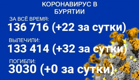 По данным на 1 июня, еще 22 человека в Бурятии заболели коронавирусом. Также за сутки 32 пациента выздоровели. Летальных исходов зарегистрировано не было. Об этом сообщает пресс-служба регионального Роспотребнадзора.